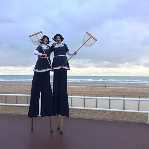 3 personnages poético-burlesque en échasses et au sol viendront partager avec vous les joies de la plage et des premiers bains de mer.